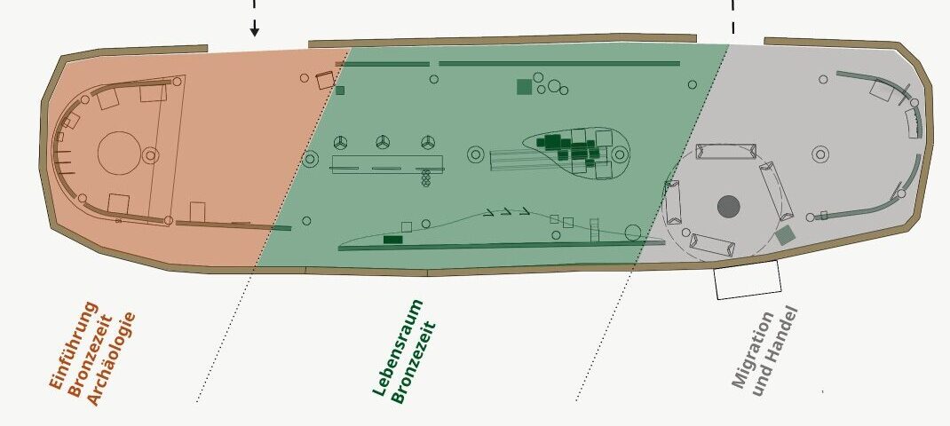1. Einführung in die Bronzezeit und in die Archäologie: Hier erfährt der Besuchende woher wir wissen, dass hier vor über 3.000 Jahren Menschen gesiedelt haben und wie wir von den Hausgrundrissen zu den Gebäudemodellen mit Hilfe der Experimentellen Archäologie gekommen sind.